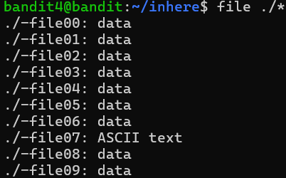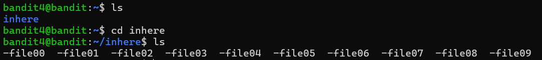 The password for the next level is stored in the only human-readable file in the inhere directory. Tip: if your terminal is messed up, try the “reset” command.